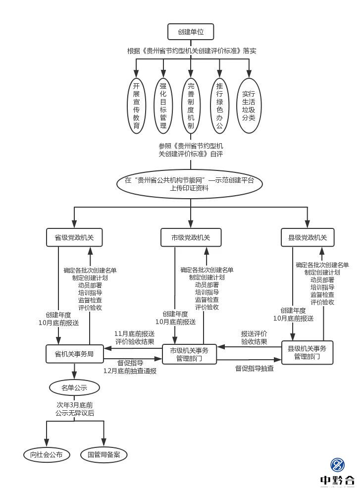 于創(chuàng)建年度10月底前對照《貴州省節(jié)約型機關創(chuàng)建評價標準》逐項開展自評,完成自評報告,準備印證材料,通過“貴州省公共機構節(jié)能網”——“示范創(chuàng)建”平臺報送本級機關事務管理部門。