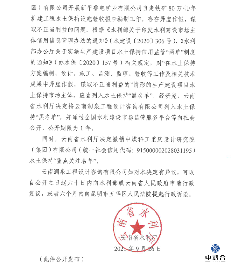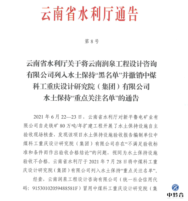 因弄虛作假被云南省水利廳列入水土保持“黑名單”!!并撤銷中煤科工重慶設(shè)計(jì)研究院“重點(diǎn)關(guān)注名單”